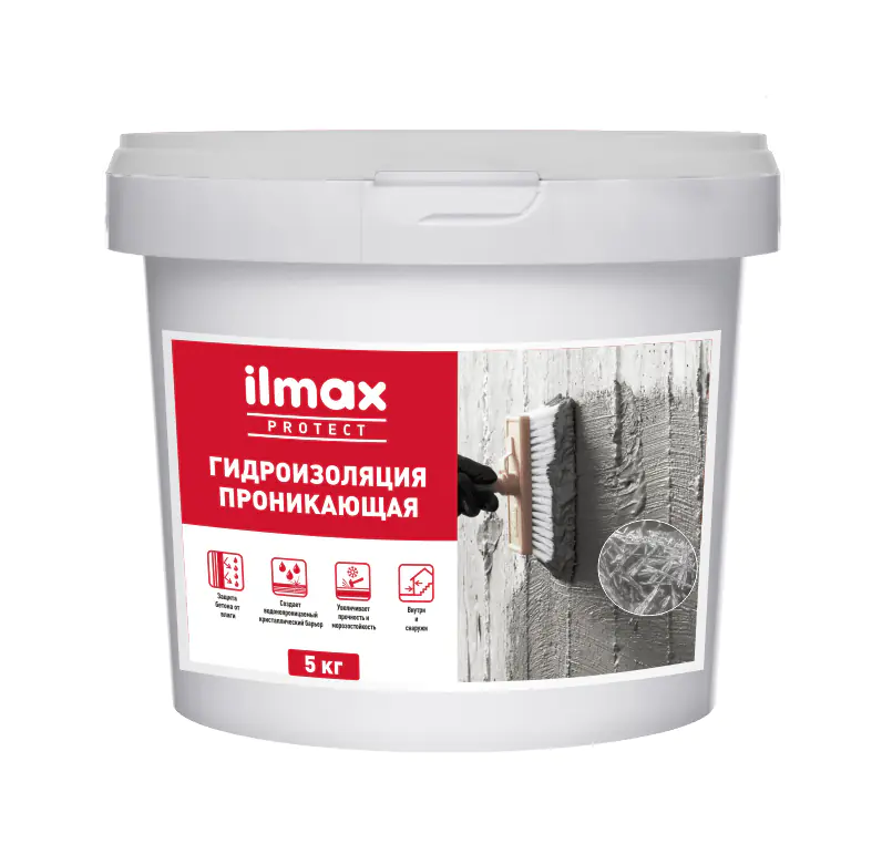 Проникающая гидроизоляция ilmax protect – капиллярная смесь, предназначенная для защиты бетонных и железобетонных строительных конструкций прочностью на сжатие не менее 15 МПа, подверженных постоянному или переменному воздействию влаги (подвалы, цокольные этажи, фундаменты и др.). Активные компоненты ilmax protect при взаимодействии с минералами бетона в капиллярных порах образуют нерастворимые соли, которые препятствуют проникновению влаги, в следствие чего повышается водонепроницаемость на 3 ступени, увеличивается прочность на 7 % и морозостойкость бетона на 1 ступень (минимум на 25 циклов). Максимальный эффект достигается через 28 суток. Производитель РБ.