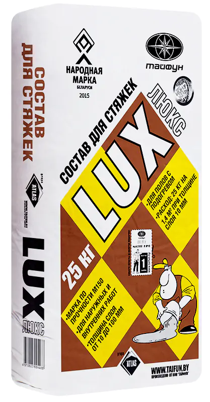 Состав цементный LUX применяется для устройства цементной стяжки внутри и снаружи помещений (температура эксплуатации от -30 до +50°С). Подходит для полов с подогревом. Марка прочности М 150. Производитель РБ.