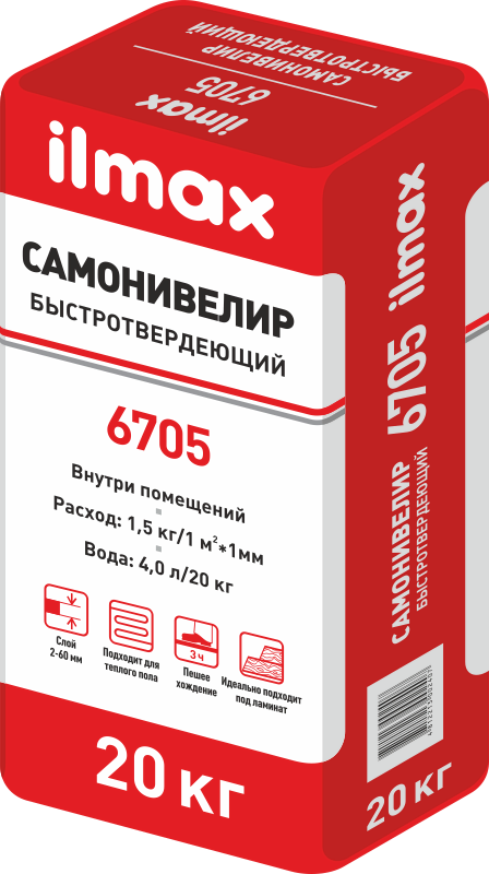 Cамонивелир быстротвердеющий ilmax 6705. На гипсовой основе. Слой от 2мм до 60мм. Пешее хождение возможно через 3 часа. Но гипсовые самонивелиры не предназначены для заливки под мягкие виды напольных покрытий (линолеум, ковролин), только под твердые (ламинат).