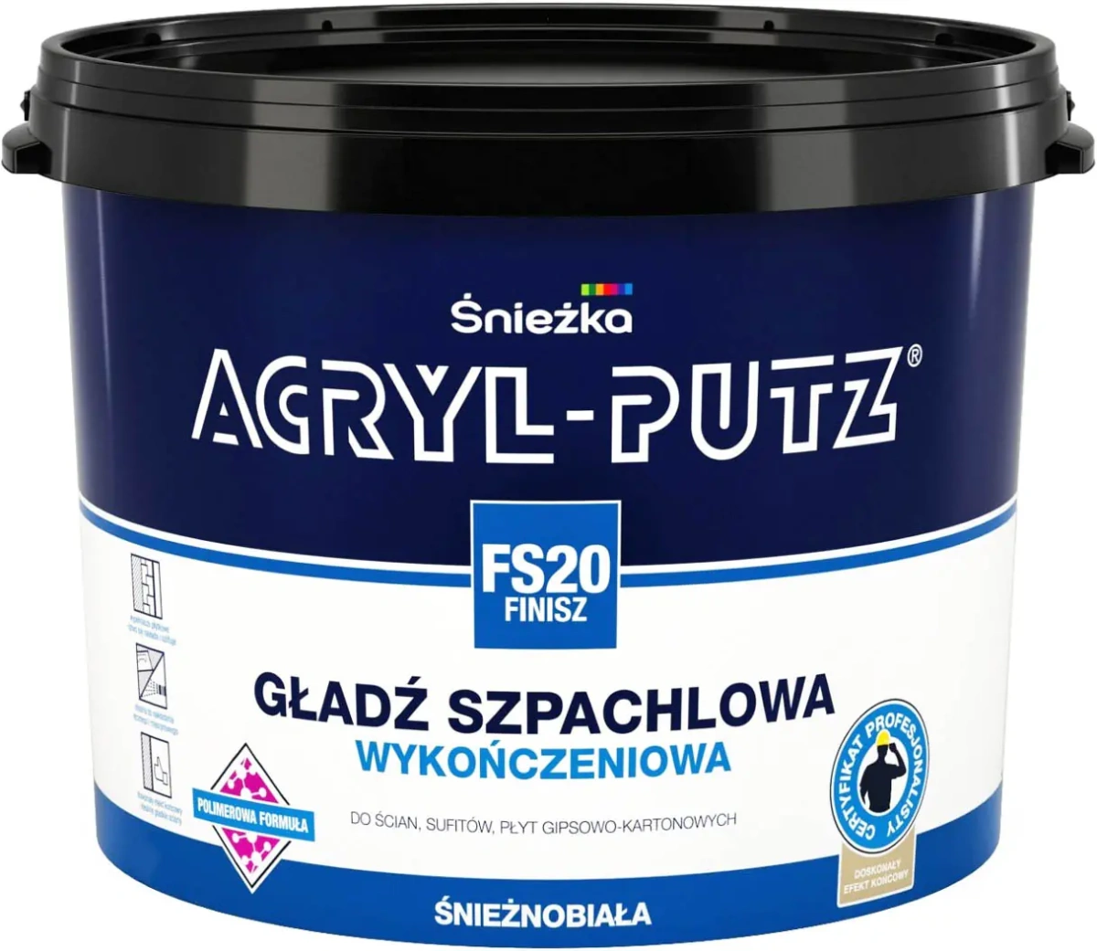 Готовая шпатлёвка АКРИЛ-ПУТЦ Финиш (Польша) предназначена для окончательного выравнивания бетонных стен и потолков, цементно-известковых и гипсовых поверхностей, а также декоративной шпатлёвки гипсокартонных плит внутри помещений. Средний расход: ведро 5 кг - 10 м.кв. в один слой.
