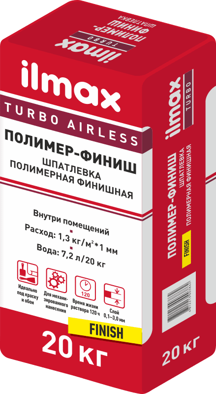 Полимерная финишная шпатлевка ilmax turbo предназначена для выравнивания шероховатостей, неровностей, заделки стыков гипсокартонных листов с использованием армирующей ленты, заполнения царапин, трещин, выбоин и других дефектов с целью получения ровной и гладкой поверхности стен и потолков под окраску или оклейку обоями. Используется по минеральным поверхностям из бетона; цементным, цементно-известковым и гипсовым штукатуркам; гипсокартонным и гипсоволокнистым листам; гипсовым плитам. Подходит для ручного и механического нанесения. Производитель РБ.